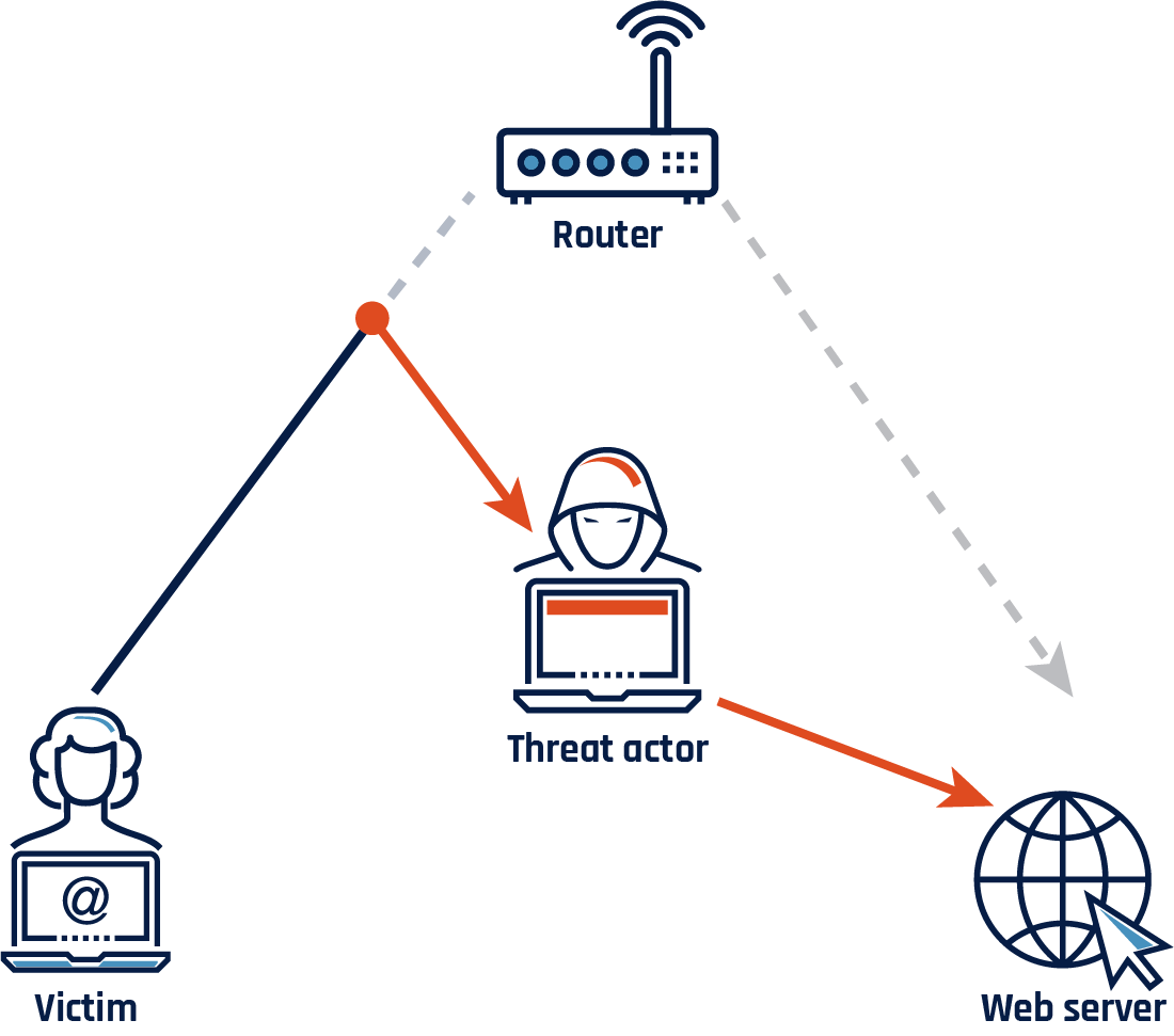 The cyber threat actor intercepts a communication between the unsuspecting user and a web server. The unsuspecting victim is under the illusion that they are communicating directly with the secure web server.