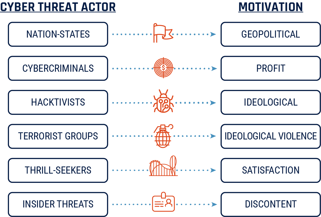 Cyber threat actors can be categorized by their motivations and, to a degree, by their sophistication. Threat actors value access to devices and networks for different reasons, such as siphoning processing power, exfiltrating or manipulating information, degrading the network’s performance and extorting the owner. Some threat actors conduct threat activity against specific individuals or organizations, while others opportunistically target vulnerable systems. In general, each category of cyber threat actor has a primary motivation.